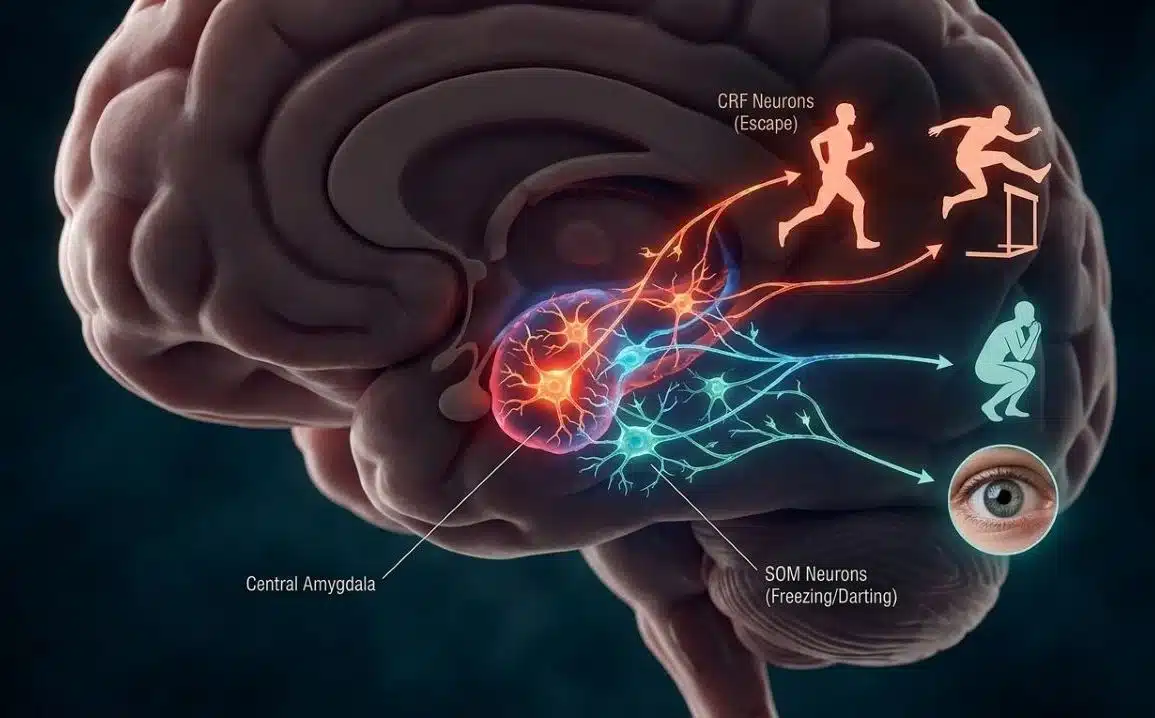 Specifically, the researchers identified distinct roles for two types of neurons in the central amygdala, an area of the brain responsible for emotional processing. Activity in corticotropin-releasing factor (CRF) neurons supported higher-intensity, escape-like responses, such as jumping. In contrast, somatostatin (SOM) neurons promoted freezing and helped regulate lower-intensity behaviors like darting.
