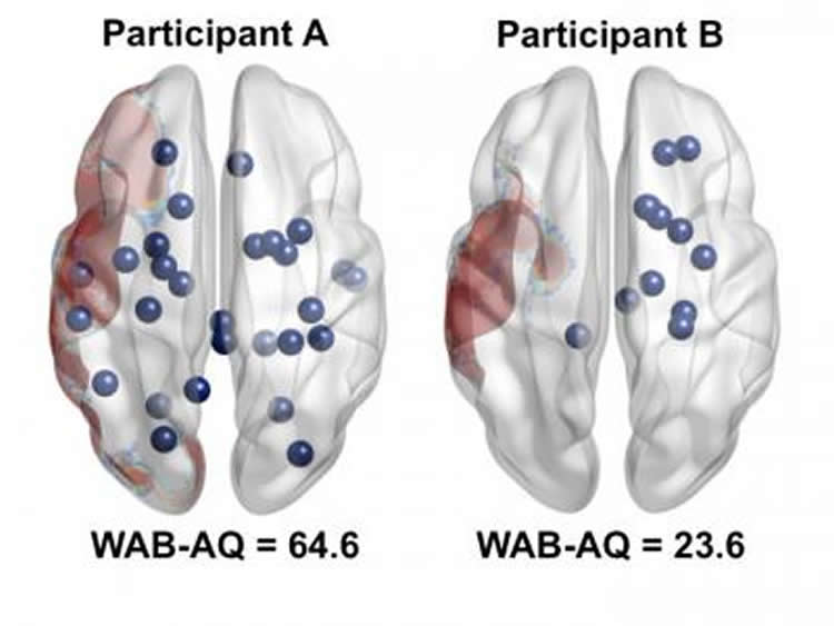 Investigators found that when imaging revealed that the post-stroke patients studied had different distributions of rich club nodes, their aphasia could differ markedly. They present a striking example in which two patients had similar volumes of stroke damage but very dissimilar numbers of rich club nodes remaining nearby. Patient B had more severe aphasia (lower WAB-AQ = 23.6) than patient A (WAB-AB = 64.6).