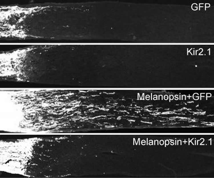 To mimic the downstream pathway of melanopsin and also stimulate neuronal activity through a different method, the researchers took a chemogenetic approach by injecting AAVs expressing DREADD-Gq into the eyes of the mice. A significant increase in axonal growth was detected as well after daily administration of a synthetic agonist clozapine-n-oxide.