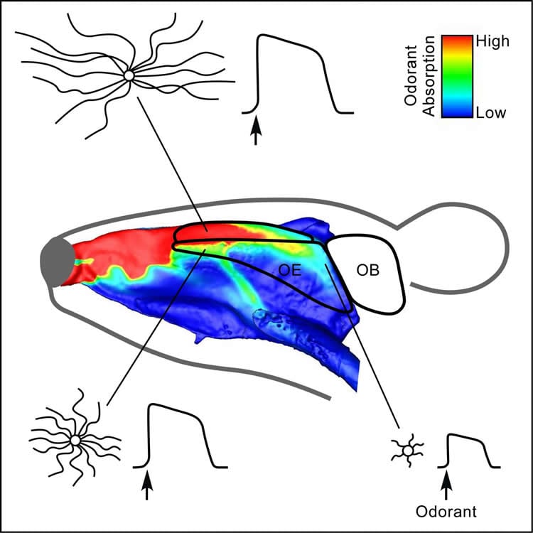 Using an array of microscopic, computational, physiological, and genetic methods, the team delved further into what factors create the patterns they observed. Cilia on OSNs of the nasal cavity underside had no significant length gradient, as opposed to the marked location-dependent length difference seen in the upper nasal cavity.