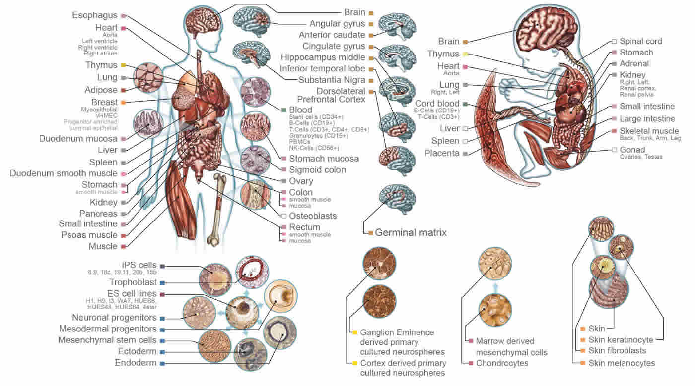 Almost all human cells have identical genomes that contain instructions on how to make the many different cells and tissues in the body. During the development of different types of cells, regulatory proteins turn genes on and off and, in doing so, establish a layer of chemical signatures that make up the epigenome of each cell. In the Roadmap Epigenomics Program, researchers compared these epigenomic signatures and established their differences across a variety of cell types. The resulting information can help us understand how changes to the genome and epigenome can lead to conditions such as Alzheimer’s disease, cancer, asthma, and fetal growth abnormalities.