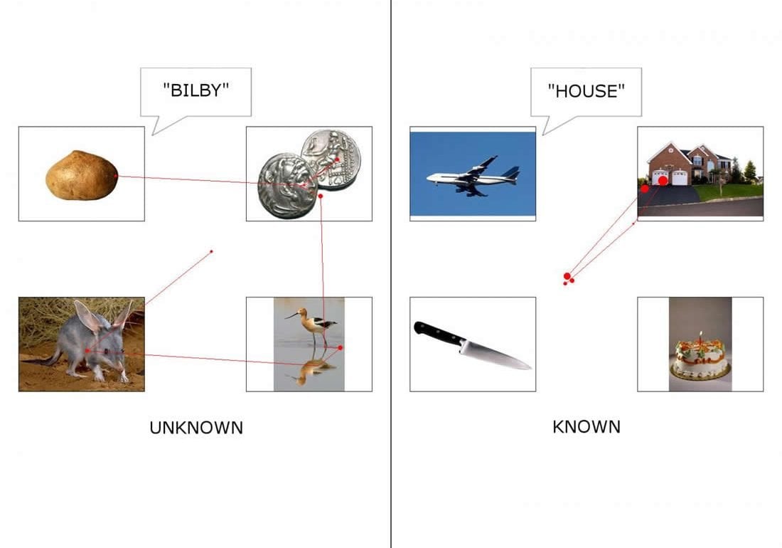 In one test researchers used a technique called eye movement monitoring. After hearing a spoken word, which matched one of four illustrations on a computer screen, the researchers tracked the subjects’ eye movements. If their eyes quickly chose the matching visual and stayed with it, that signaled knowledge of the word. If the eyes flitted from one object to the next, it demonstrated the word was probably not known.