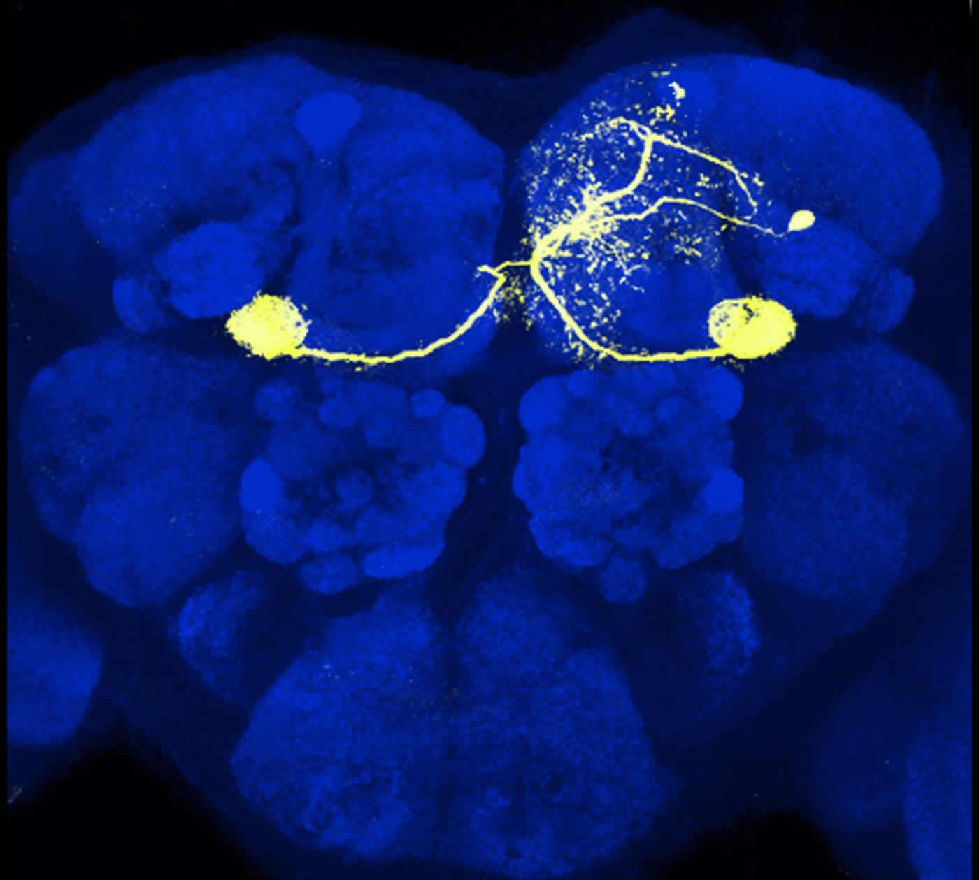 The researchers exposed fruit flies to a specific test odor and a very short time later subjected them to an artificial aversive cue. To do so they fired tiny beams of laser light at dopamine-releasing neurons in the mushroom body that were genetically engineered to become active in response to the light. Just like our own neurons, dopamine-releasing neurons in the fly are involved in reward and punishment.” Presenting the smell of cherries, for example, which is normally an attractive odor to flies, while at the same time stimulating a particular dopamine neuron, trains the fly to avoid cherry odor,” Turner explains.
