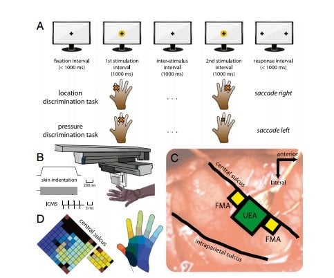 The first set of experiments focused on contact location, or sensing where the skin has been touched. The animals were trained to identify several patterns of physical contact with their fingers. Researchers then connected electrodes to areas of the brain corresponding to each finger and replaced physical touches with electrical stimuli delivered to the appropriate areas of the brain. The result: The animals responded the same way to artificial stimulation as they did to physical contact.