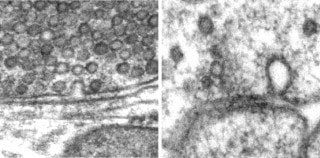 Next, the sapphire disks with neurons were put into liquid epoxy, which hardened and then were thin-sliced so the neurons could be photographed under an electron microscope. The ultrafast formation of recycled vesicles was visible.
