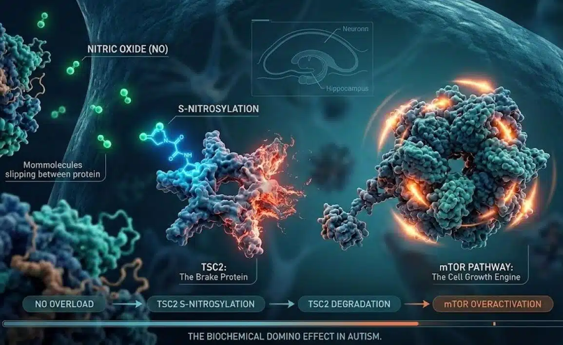 - The “Brake” Failure: TSC2 is a critical checkpoint. When nitric oxide levels are too high, the “brakes” on protein production are removed, leading to the cellular dysregulation often seen in ASD.