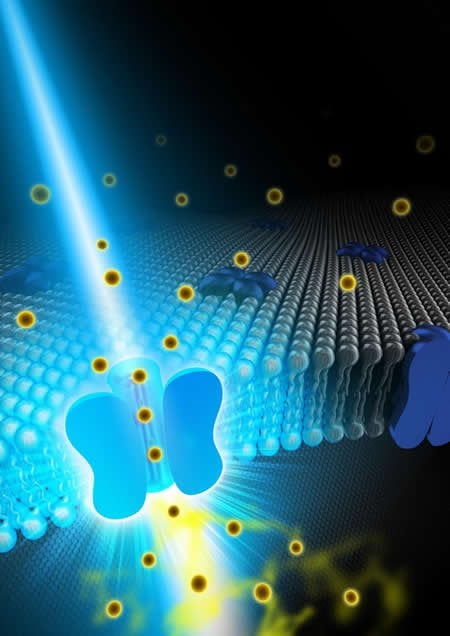In optogenetics, a light-sensitive plant photoreceptor and an animal protein that affects cell membrane ion channels, bind together and are introduced to target cells. They work together and respond to a stimulus from a particular wavelength of light to open (or close) a particular ion channel.