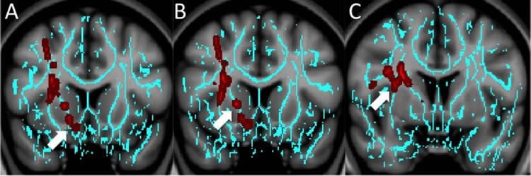 The researchers saw unique white matter injury patterns in the patients who had depression or anxiety. Compared to controls, patients with depression had decreased fractional anisotropy (FA), a measure of the structural integrity of white matter connections, around an area near the deep gray matter of the brain that is strongly associated with the brain’s reward circuit.