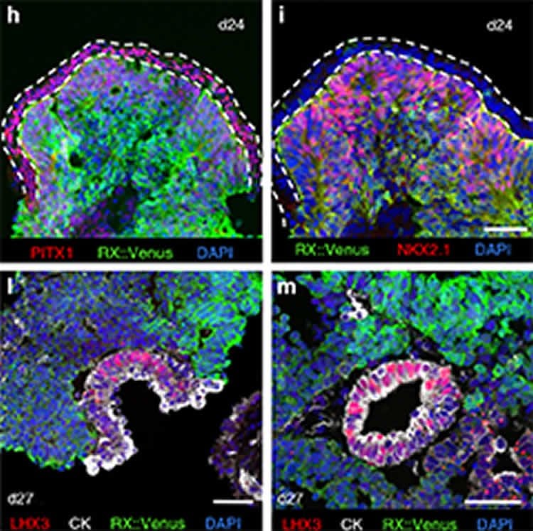 In search for a fundamental remedy, the RIKEN team first recreated human pituitary embryonic development in a 3D culture. By exposing human embryonic stem cells to two key signaling molecules—hedgehog and BMP4—and by using a complex process called SFEBq, they were able to grow two structures necessary for inducing the pituitary—the oral ectoderm and hypothalamic neuroepithelia.
