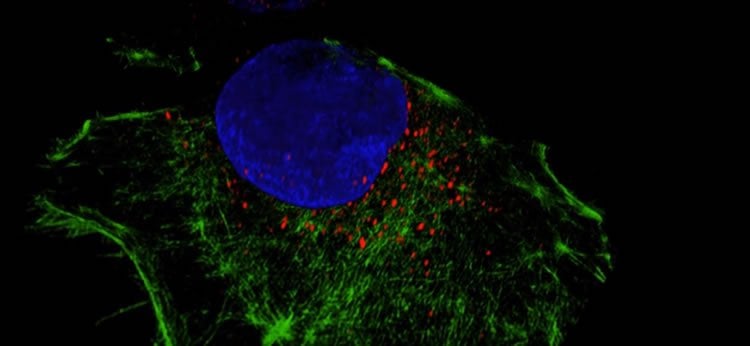 This is the first super-resolution microscopy showing replication of Zika virus in a human cell. The images were taken Jan. 25, 2016. The red dots represent virus replication sites, the green structures are actin and the large blue structure is the cell nucleus.